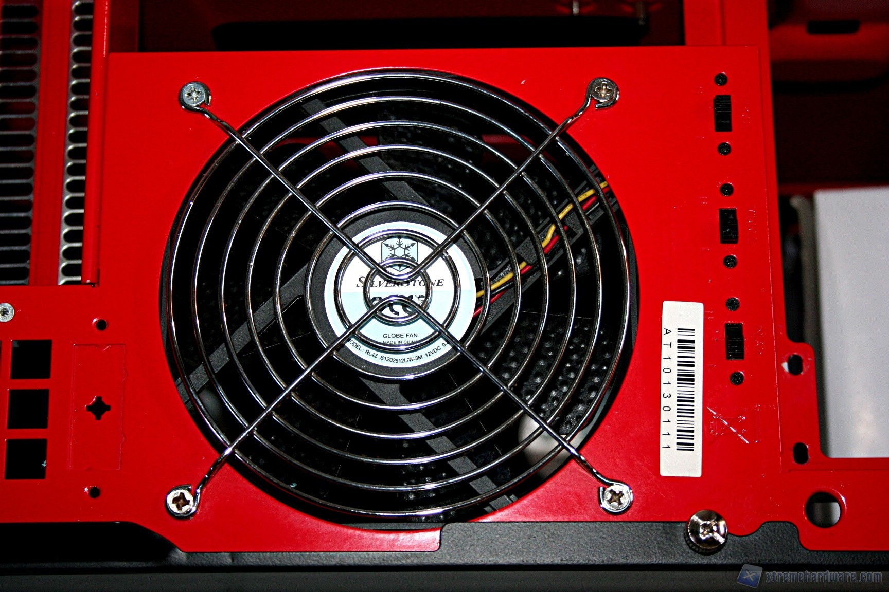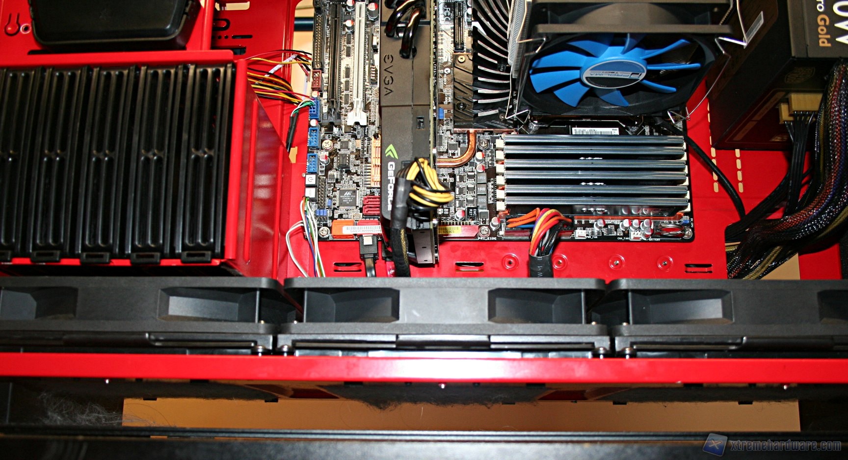 Non è presente la ventilazione frontale per come siamo abituati a concepirla, similmente al TJ04-Evolution, ma data la presenza di ben tre ventole da 180mm inferiori e dato il posizionamento ruotato della scheda madre, non ce ne sarà bisogno. I dischi rigidi possono essere raffreddati dalla prima ventola AP181, che oltre ad essere settata in immissione, permette di aumentare l’aerazione anche nel comparto frontale del cabinet, evitando ristagni di aria calda.