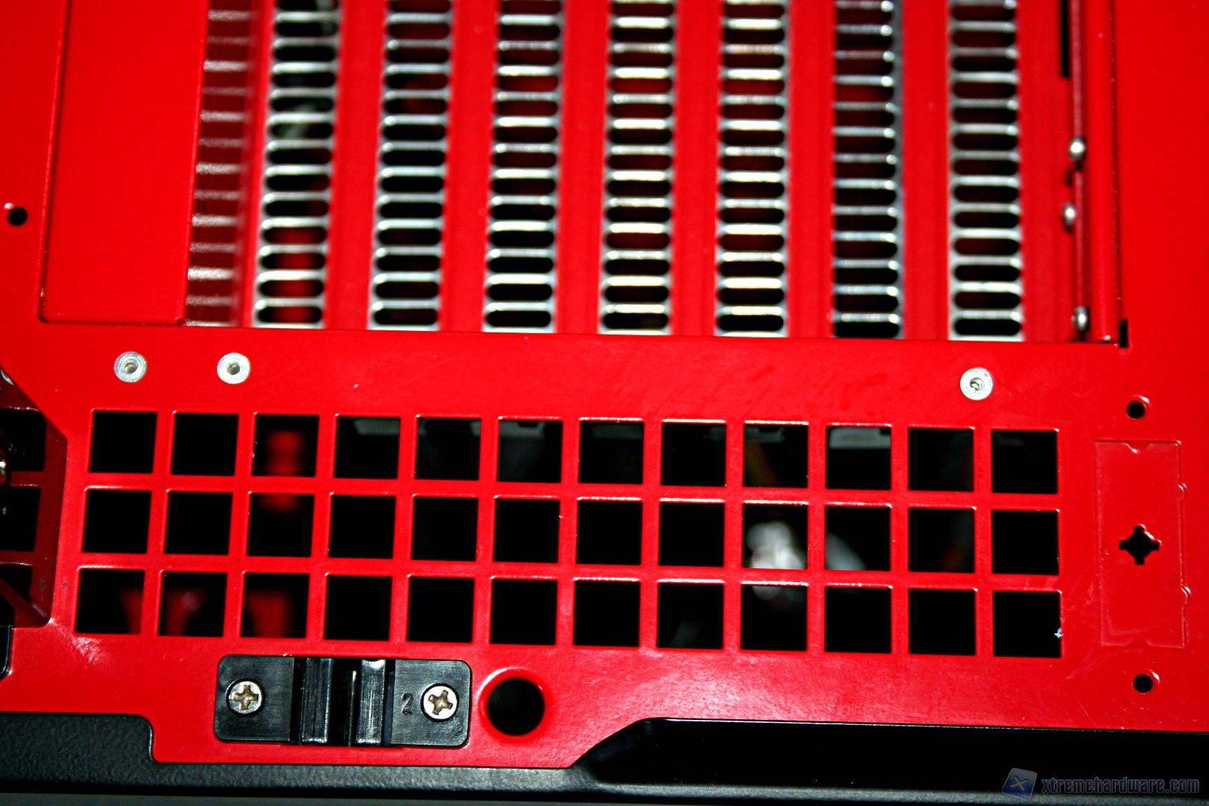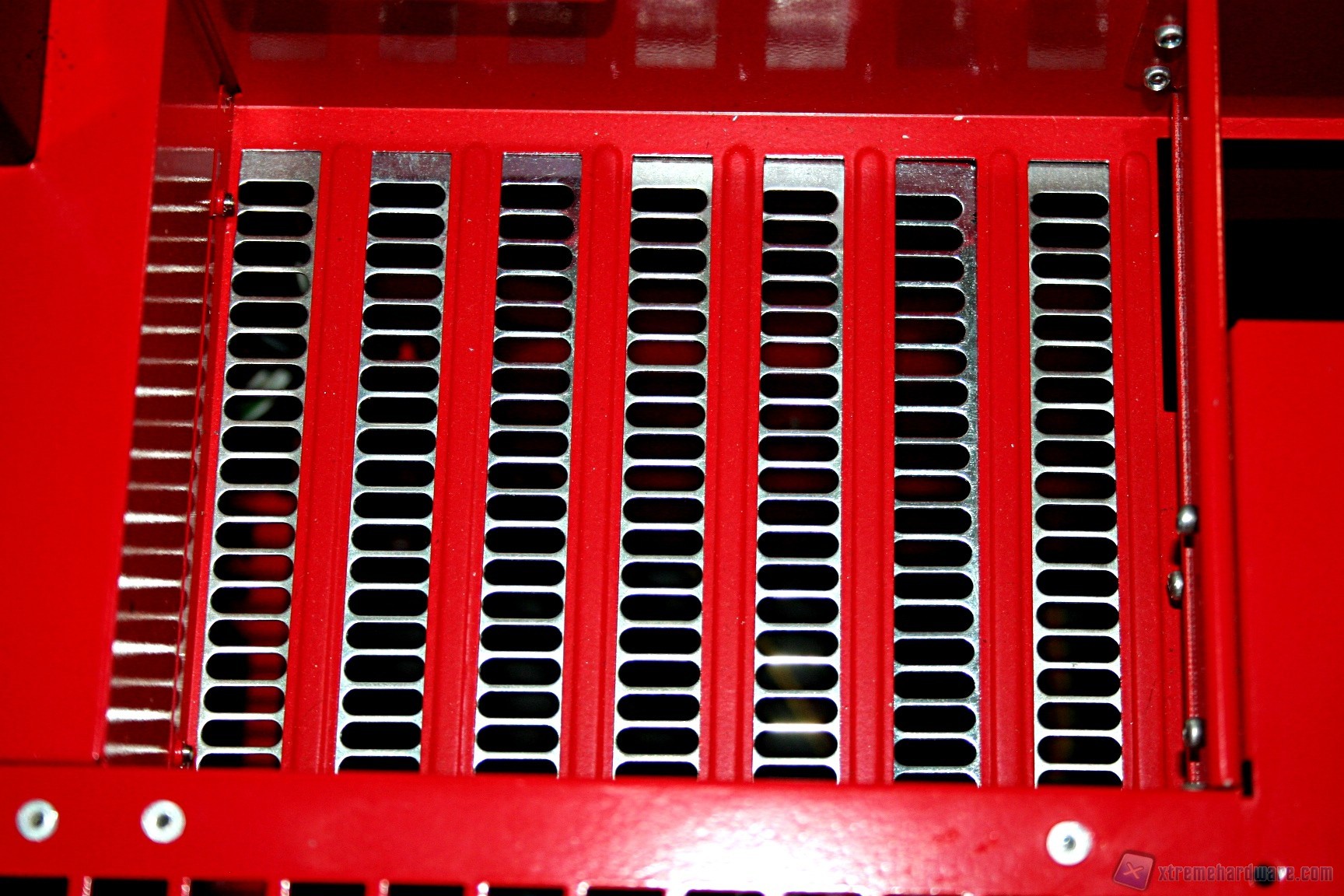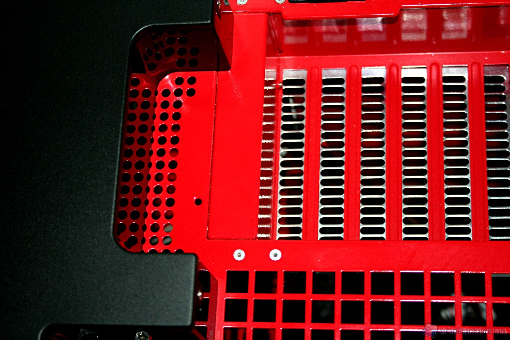 (*) Dato il fenomeno della pressione positiva gli slot PCI sono perforati per scelta, così facendo si impedirà comunque il potenziale ricircolo dell’aria calda all’interno della GPU per via del fatto che l’aria tenderà ad uscire, essendo sbilanciata l’immissione con l’estrazione all’interno del cabinet. Nel TJ09 invece sono state chiuse per via dell’assenza della pressione positiva, che aiuta a risolvere il problema del loop di ristagno che fa aumentare le temperature su cabinet orientati in configurazione classica, ma ovviamente in questo caso la situazione è decisamente diversa, essendo il piatto della scheda madre completamente ruotato.