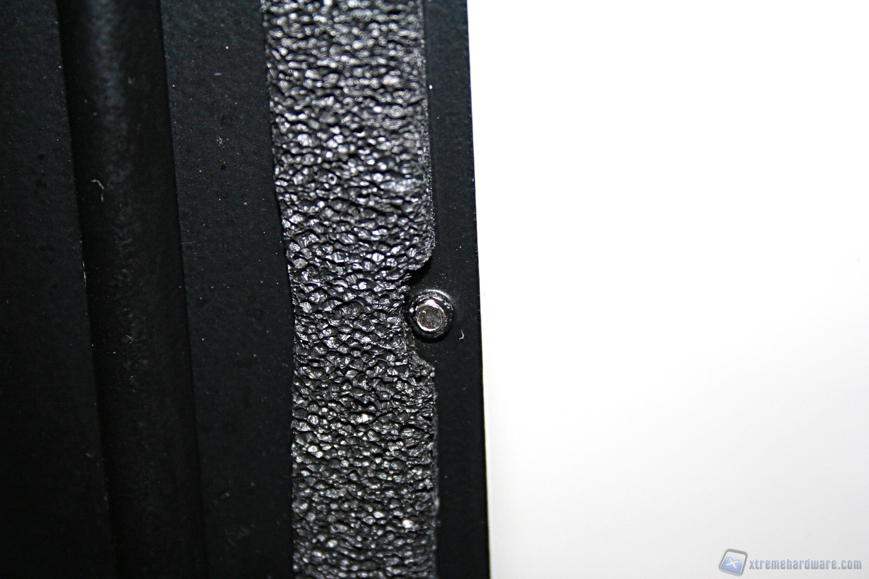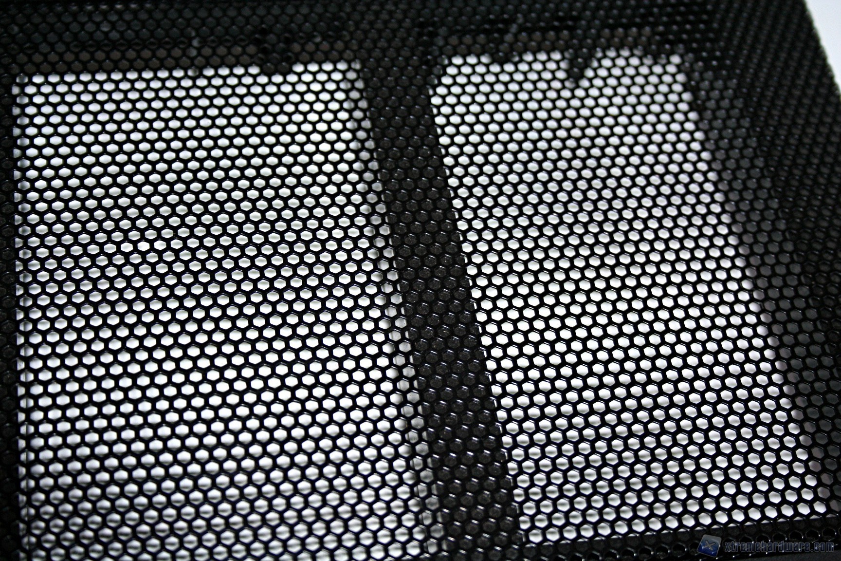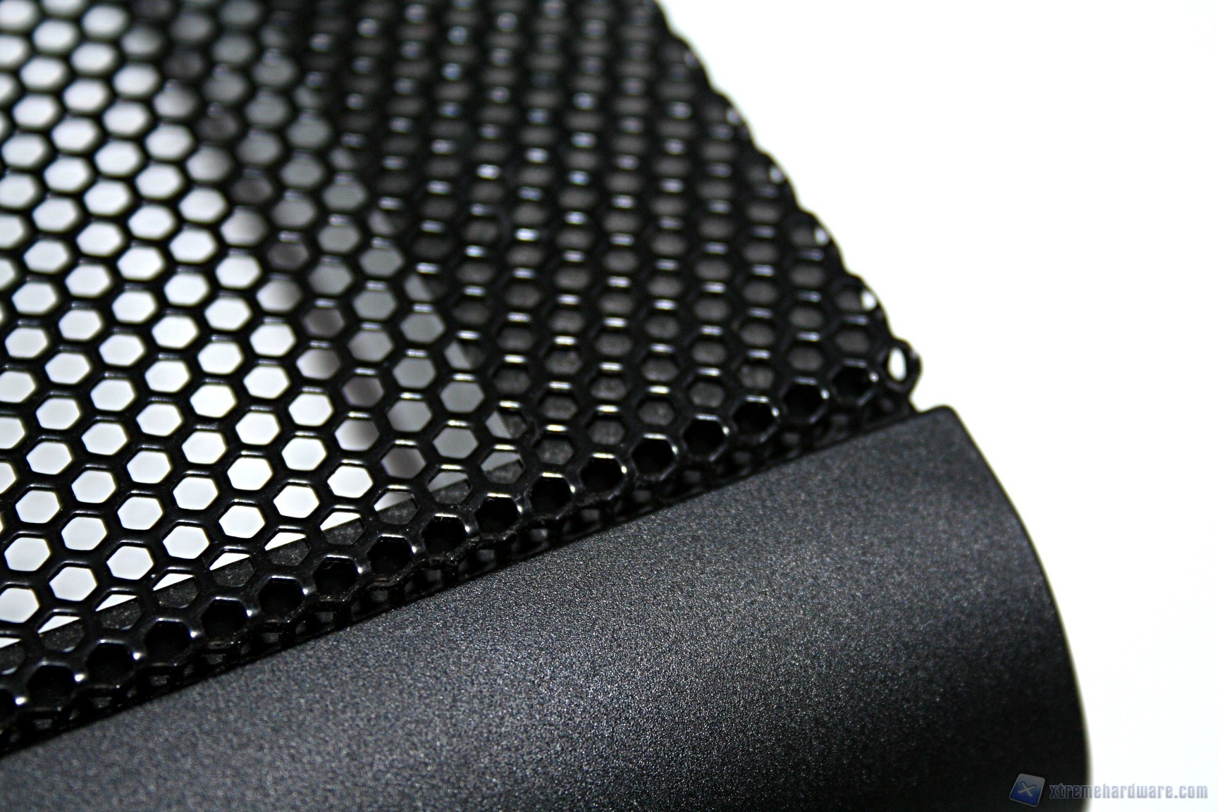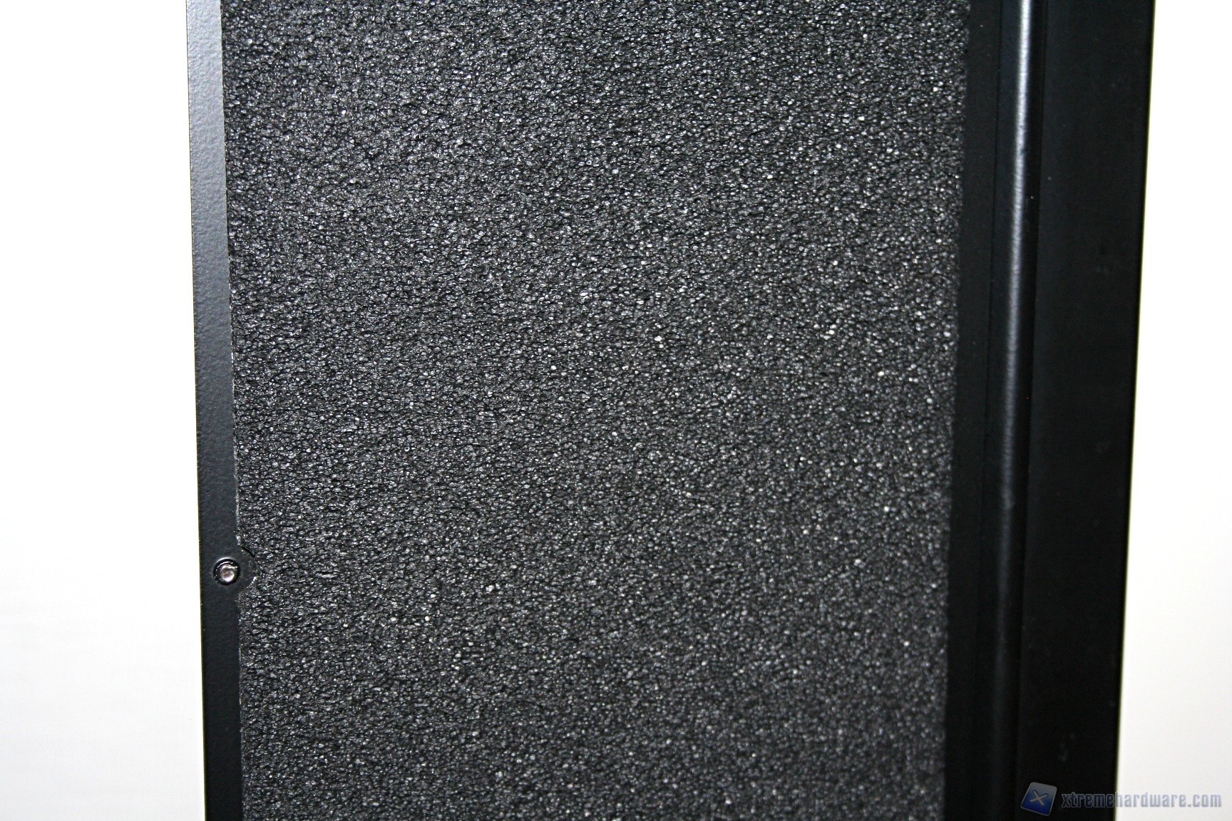 In basso abbiamo 2 ottimi supporti gommati antivibrazione ed antiscivolo, orizzontali. Non è possibile montare rotelle per lo spostamento del case. Al di sopra del telaio unibody troviamo un lungo foro, alto circa 2 m, che funge da presa d’aria per l’FT02. All'interno della paratia finestrata, sono posizionati tre filtri antipolvere, specifici per ciascuna delle tre AP181, comodamente estraibili lateralmente. Purtroppo tali filtri non sono posizionati in modo ideale e favoriscono nel tempo un accumulo di polvere direttamente al di sotto di essi. In ambienti particolarmente impolverati, ciò potrebbe ridurre nel tempo le prestazioni del cabinet, anche se durante i nostri test non abbiamo riscontrato particolarmente problemi. Consigliamo l’installazione di filtri magnetici, o di un grande filtro estraibile, posizionato alla base del telaio, e non sopra di esso.