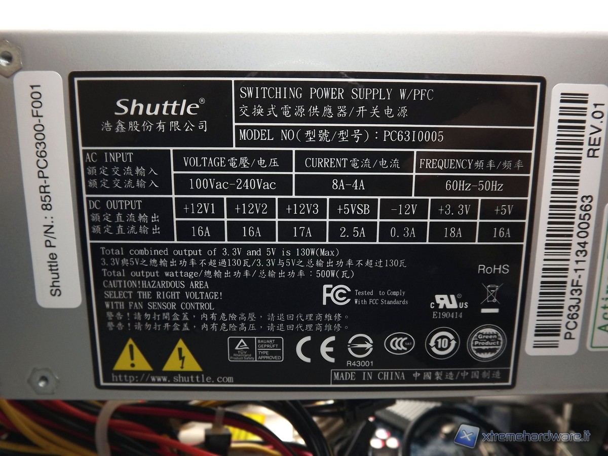 L'alimentatore incluso in questo Barebone ha un potenza massima di 500W ed ha ricevuto la certificazione 80 Plus Bronze. Questo significa che l'alimentatore fornisce più del 82/85/82% di efficienza energetica con carichi nominali pari a 20/50/100%. Il PSU Shuttle dispone di un circuito Active PFC (Power Factor Correction). L'alimentatore è dotato di connettore a ATX Power 20pin e ATX Power 4pin (CPU) già collegati alla scheda madre. Completano la dotazione di connettori 4 connettori Power SATA, 2 connettori molex 4 pin, un connettore Pci-Express a 6pin ed un altro 8pin (6+2) che vanno usati nel caso in cui installiamo nel sistema una VGA di tipo discreta. Le specifiche per quanto riguarda gli amperaggi sono davvero di spessore.